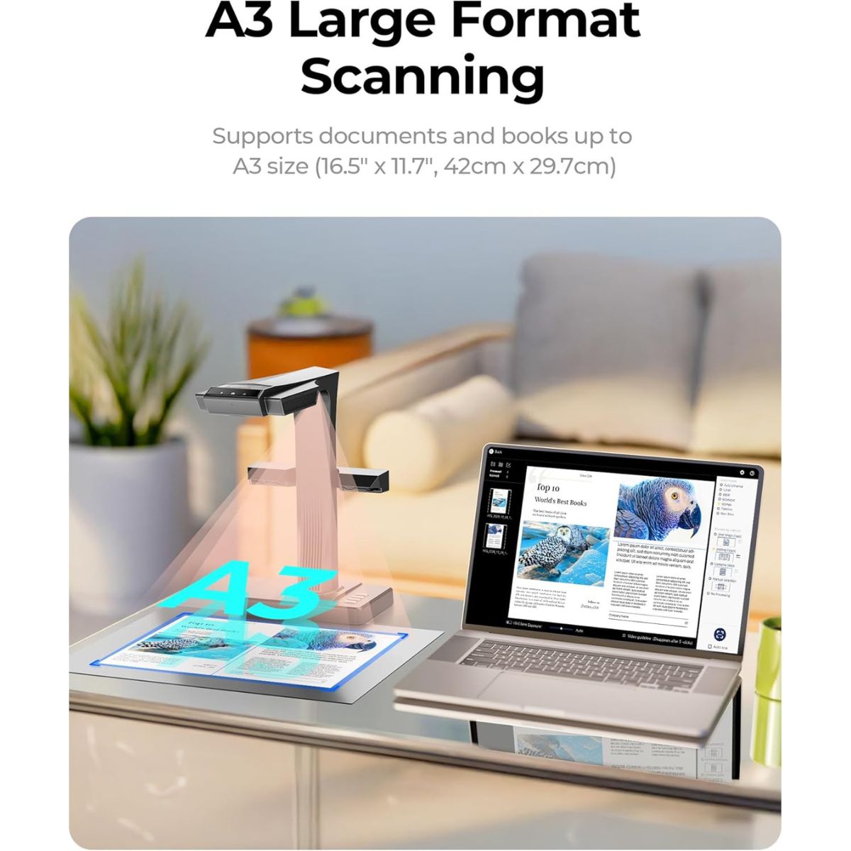 - A3 Capture Capability: Scans large documents, magazines, engineering drawings and bound books with ease.